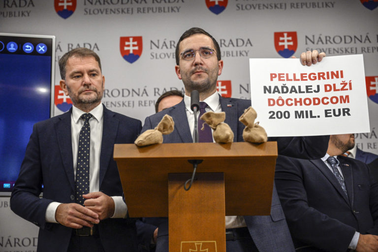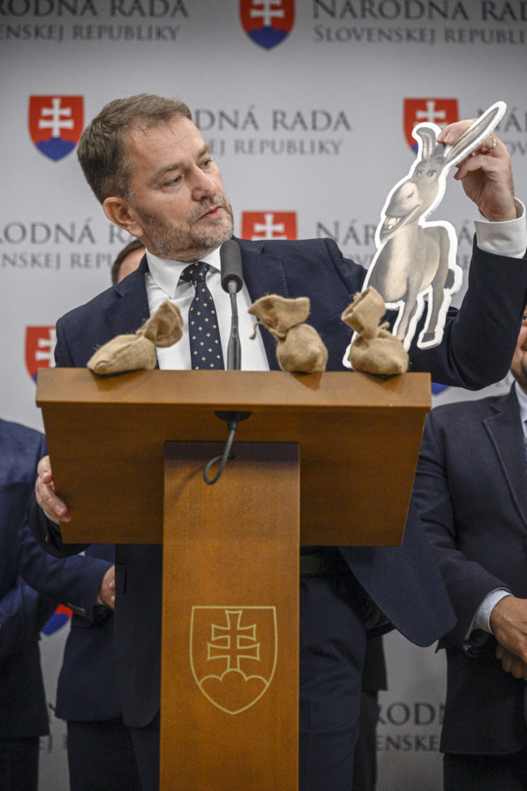 Poslanci NR SR za hnutie Slovensko Igor Matovič (vľavoí ) a Július Jakab počas vyjadrenia hnutia Slovensko k schváleniu programového vyhlásenia vlády (PVV) Roberta Fica a Oslíček otras sa v rámci rokovania 3. schôdze Národnej rady SR. Bratislava, 21. november 2023. Foto: archívne, SITA/ Milan Illík