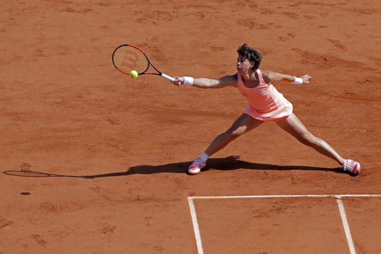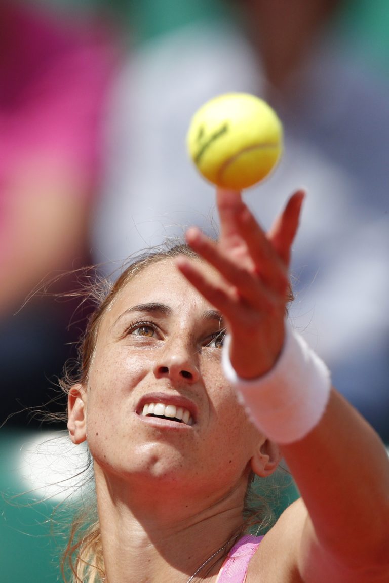 Španielska tenistka Carla Suárezová-Navarrová počas osemfinálového zápasu Roland Garros, v ktorom podľahla Rumunke Simone Halepovej dvakrát 1:6. Paríž, 5. jún 2017. Foto: SITA/AP.