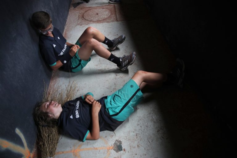 Zberači loptičiek odpočívajú počas piatkového programu Roland Garros. Paríž, 2. jún 2017. Foto: SITA/AP