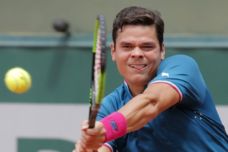 Kanadský tenista Milos Raonic počas zápasu 3. kola Roland Garros, v ktorom jeho súper, Španiel Guillermo García-López, za stavu 1:6 a 0:1 odstúpil. Paríž, 2. jún 2017. Foto: SITA/AP.