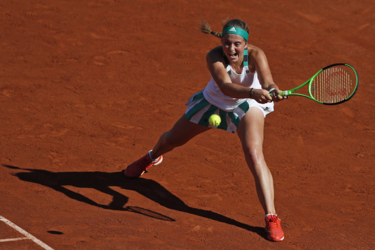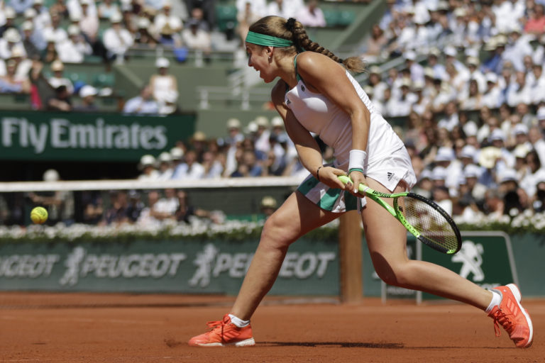 Lotyšská tenistka Jelena Ostapenková počas semifinálového zápasu Roland Garros, v ktorom zdolala Švajčiarku Timeu Bacsinszkú 7:6 (4), 3:6, 6:3. Paríž, 8. jún 2017. Foto: SITA/AP