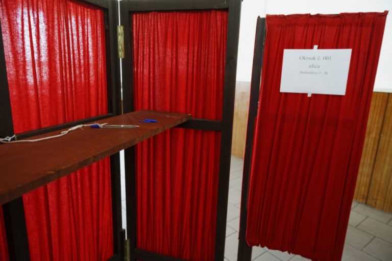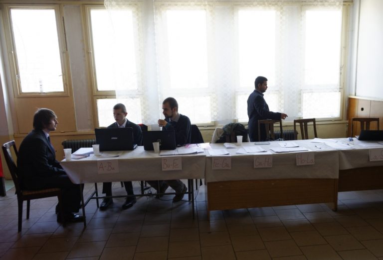 Spoločná volebná miestnosť dvoch volebných okrskov na sídlisku Luník IX počas druhého kola voľby prezidenta Slovenskej republiky. Košice, 29. marec 2014. Foto: SITA/Ivan Fleischer