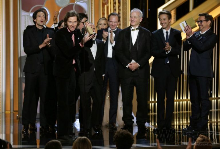 Zlatý glóbus za najlepší film v kategórii komédia alebo muzikál získal Grandhotel Budapešť. Režisér Wes Anderson (druhý zľava) si preberá ocenenie. Foto: SITA/AP