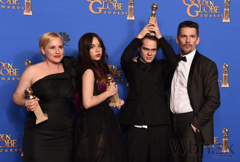 Zlatý glóbus za najlepší film v kategórii dráma získalo Chlapčenstvo. Na fotografii: Zľava: Patricia Arquette, Lorelei Linklater, Ellar Coltrane a Ethan Hawke pózujú fotografom so Zlatými glóbusmi v rukách. Film Chlapčenstvo získal aj ďalšie dve trofeje, keď Patriciu Arquette ocenili za herecký výkon vo vedľajšej úlohe a Richarda Linklatera za réžiu. Foto: SITA/AP
