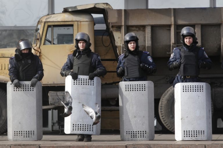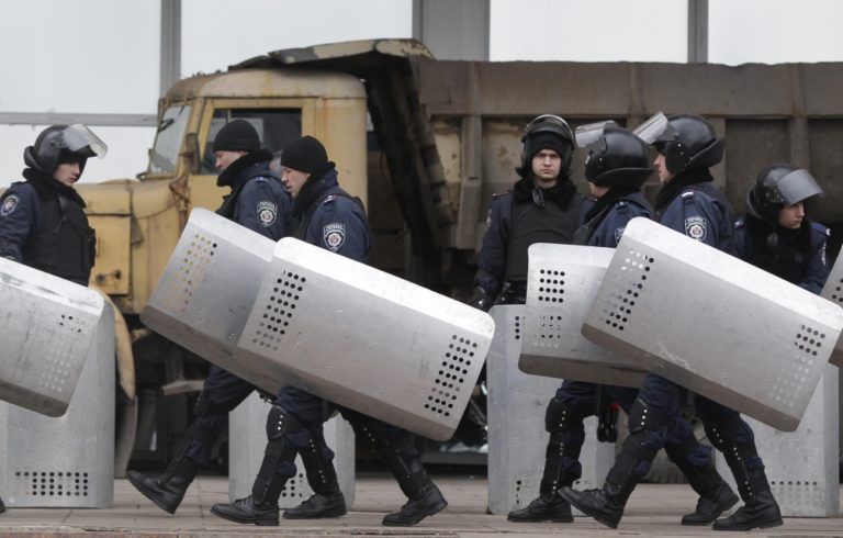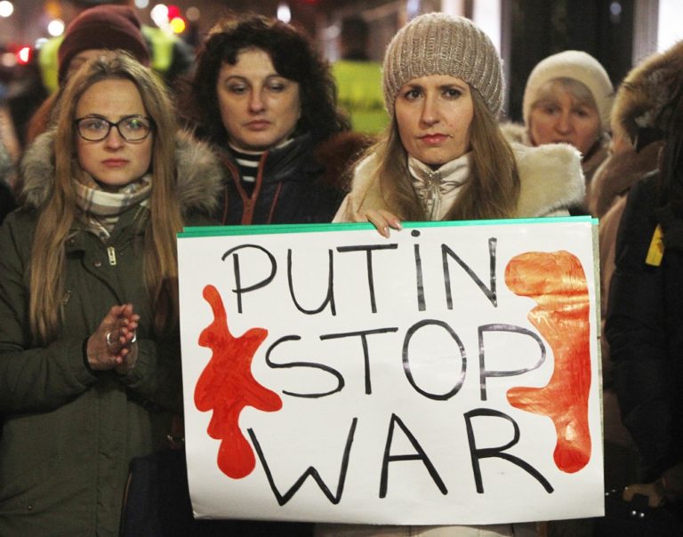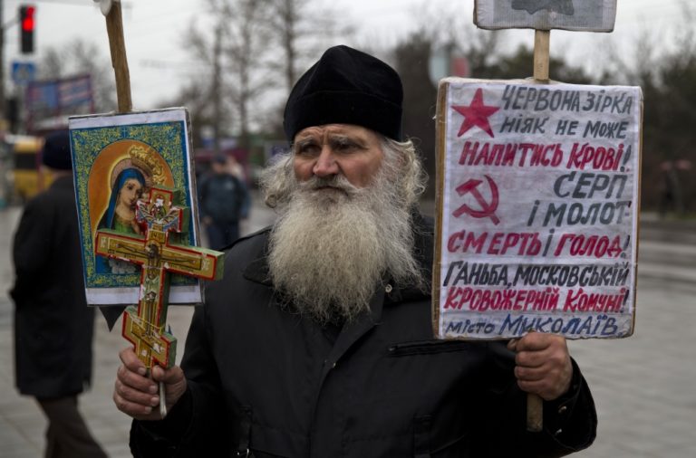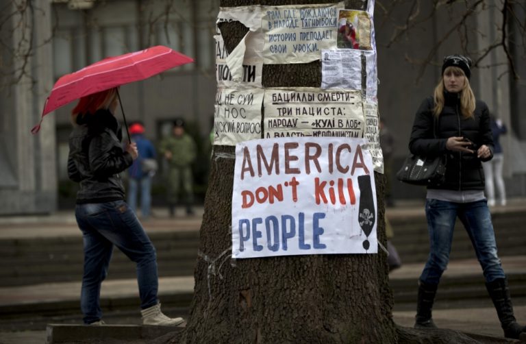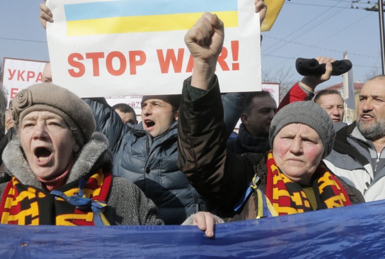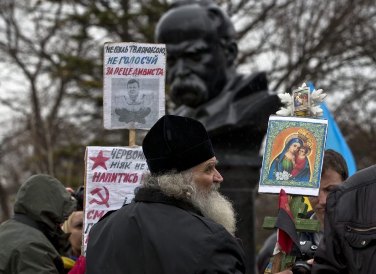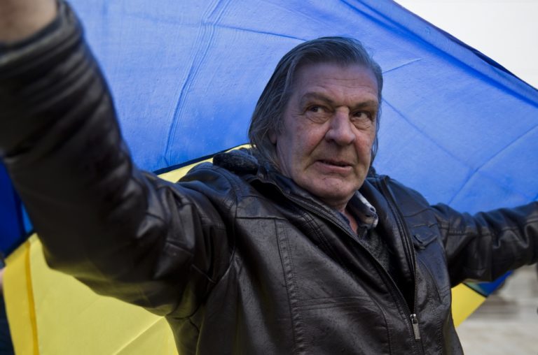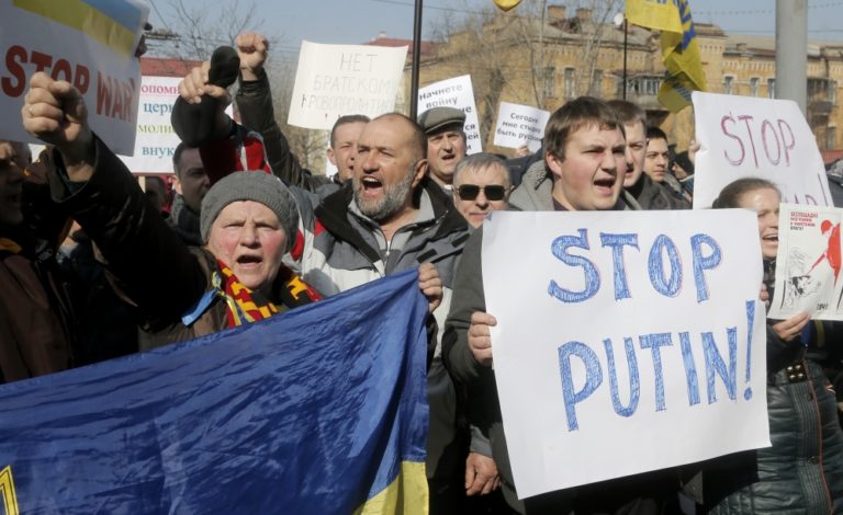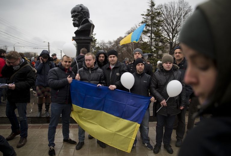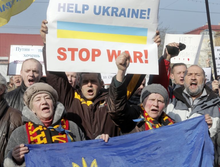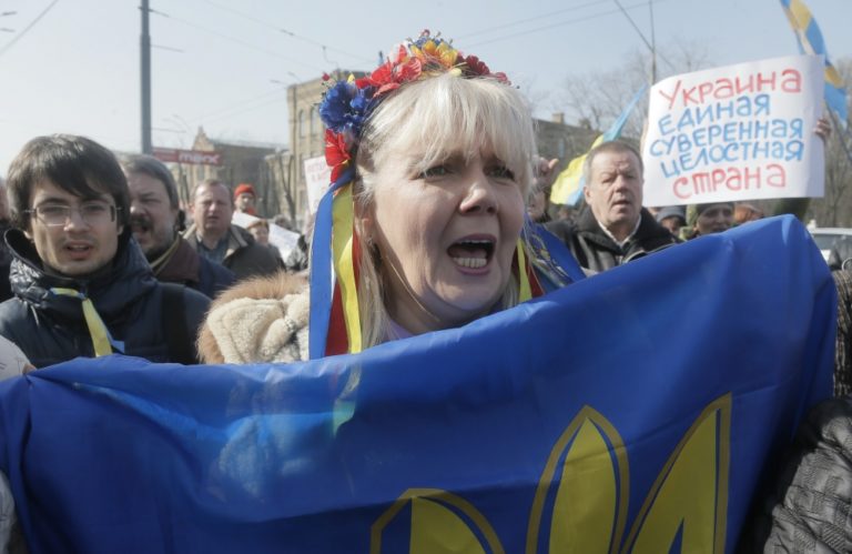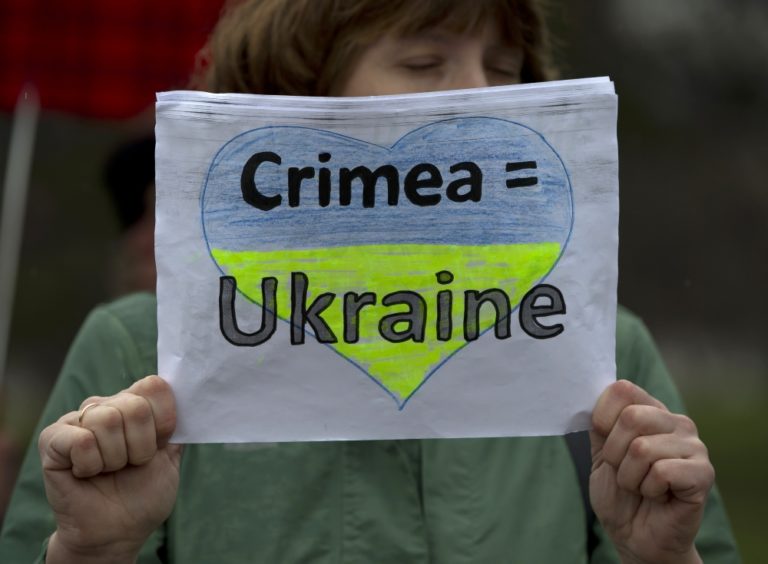 Medzi jednotlivými obyvateľmi Krymu to vrie. V Simferopoli demonštrujú jedni, aj druhí. Foto: SITA/AP