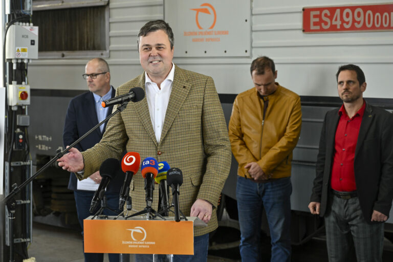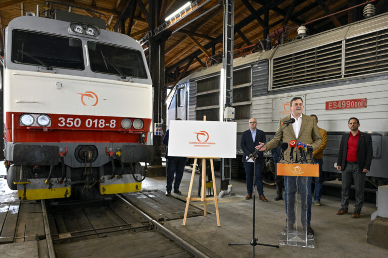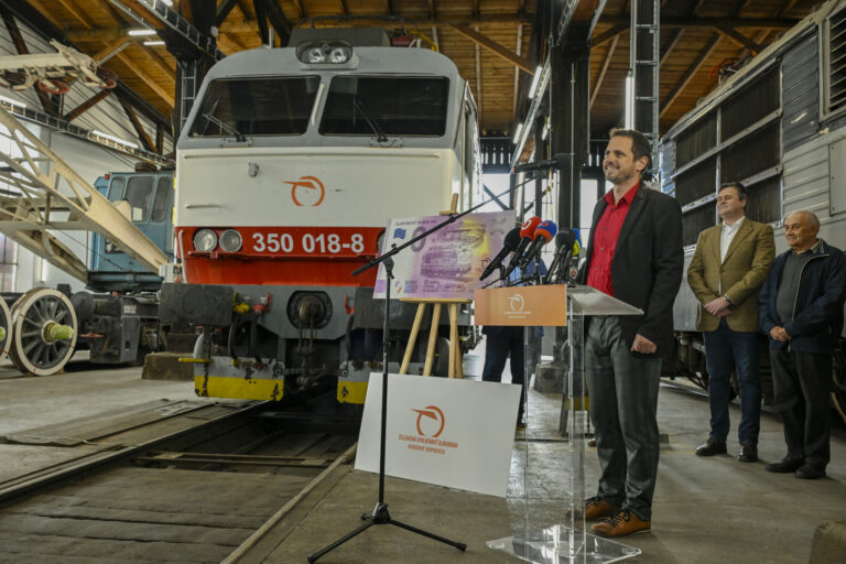 Generálny riaditeľ ZSSK Peter Helexa (v popredí) počas tlačovej konferencie v rušňovom depe v Bratislave pri príležitosti symbolickej rozlúčky s ikonickými rušňami typu 350, prezývanými Gorily, ktoré po 50 rokoch služby na slovenských tratiach postupne odchádzajú do dôchodku. Bratislava, 7. október 2024. Foto: SITA/Milan Illík