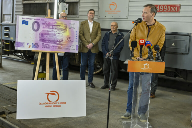 Sprava: Podpredseda predstavenstva ZSSK Martin Bahurinský, autor vizuálu zberateľskej eurobankovky Adrián Ferda, člen predstavenstva ZSSK Karol Henzély a generálny riaditeľ ZSSK Peter Helexa počas tlačovej konferencie v rušňovom depe v Bratislave pri príležitosti symbolickej rozlúčky s ikonickými rušňami typu 350, prezývanými Gorily, ktoré po 50 rokoch služby na slovenských tratiach postupne odchádzajú do dôchodku. Bratislava, 7. október 2024. Foto: archívne, SITA/Milan Illík