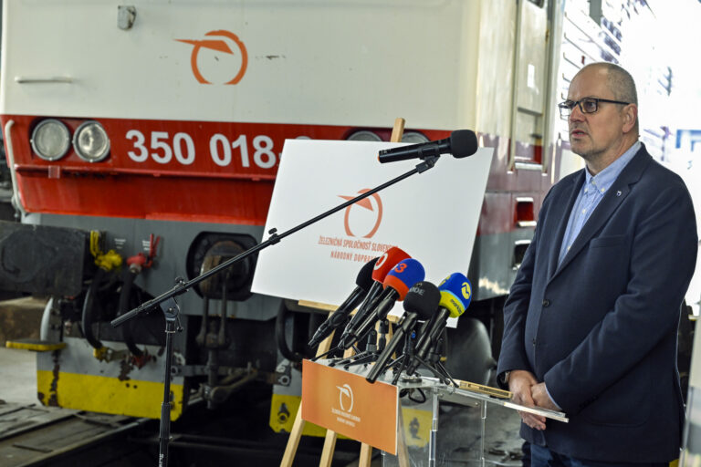 Generálny riaditeľ ZSSK Peter Helexa počas tlačovej konferencie Železničnej spoločnosti Slovensko v rušňovom depe v Bratislave pri príležitosti symbolickej rozlúčky s ikonickými rušňami typu 350, prezývanými Gorily, ktoré po 50 rokoch služby na slovenských tratiach postupne odchádzajú do dôchodku. Bratislava, 7. október 2024. Foto: SITA/Milan Illík