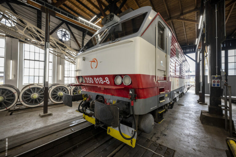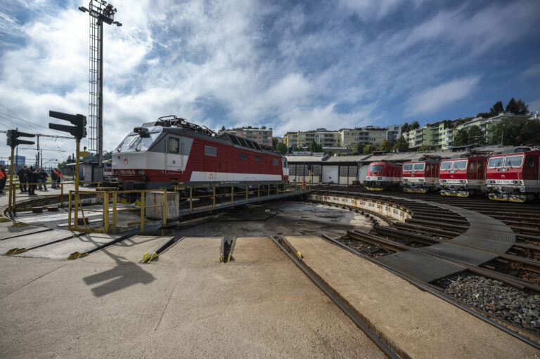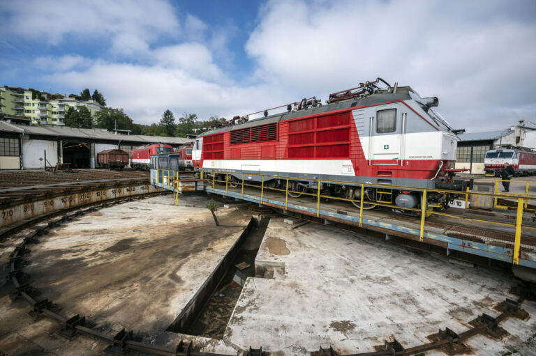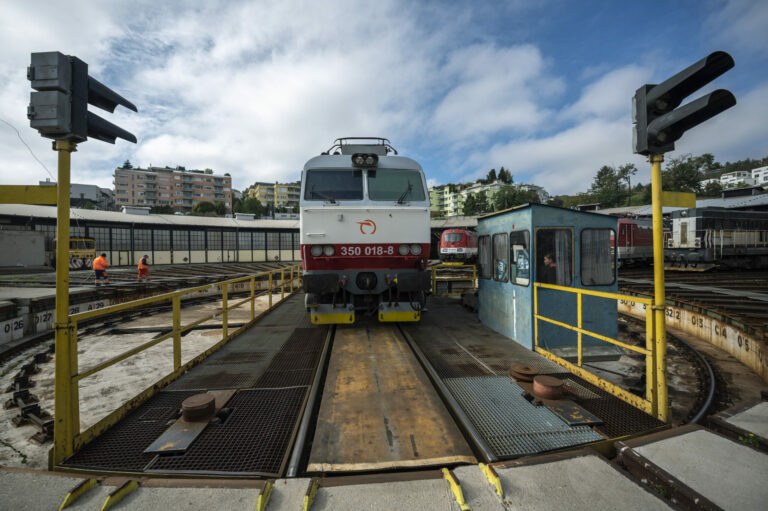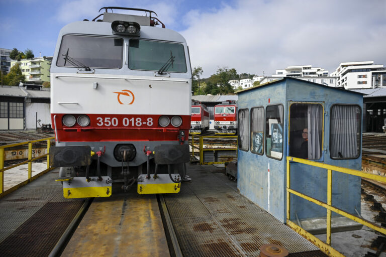 Rušeň Gorila na točni v rušňovom depe v Bratislave pri príležitosti symbolickej rozlúčky s ikonickými rušňami typu 350, prezývanými Gorily, ktoré po 50 rokoch služby na slovenských tratiach postupne odchádzajú do dôchodku. Bratislava, 7. október 2024. Foto: SITA/Milan Illík