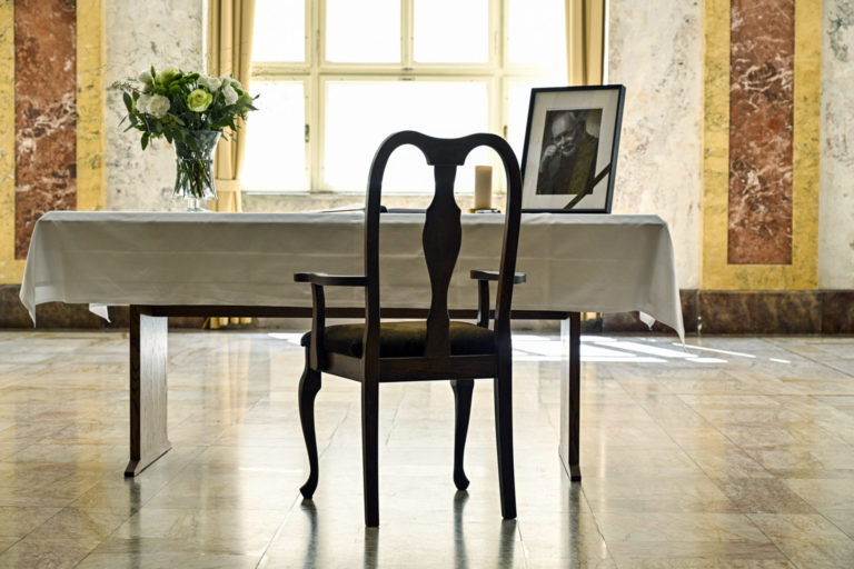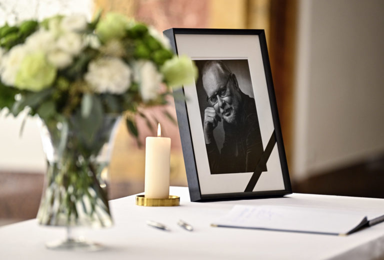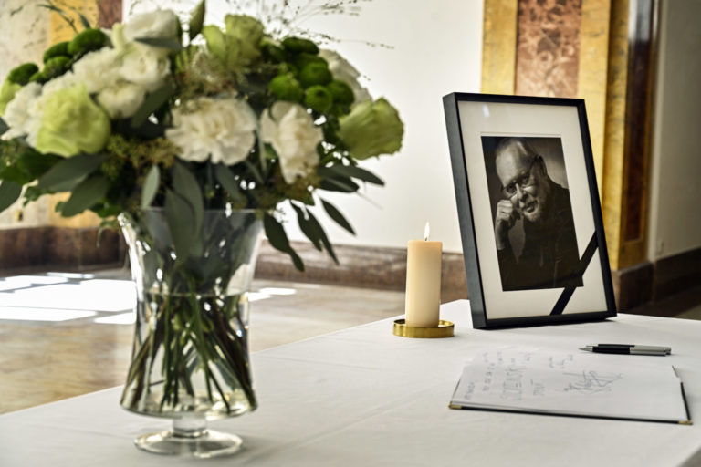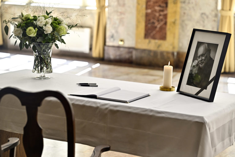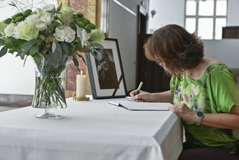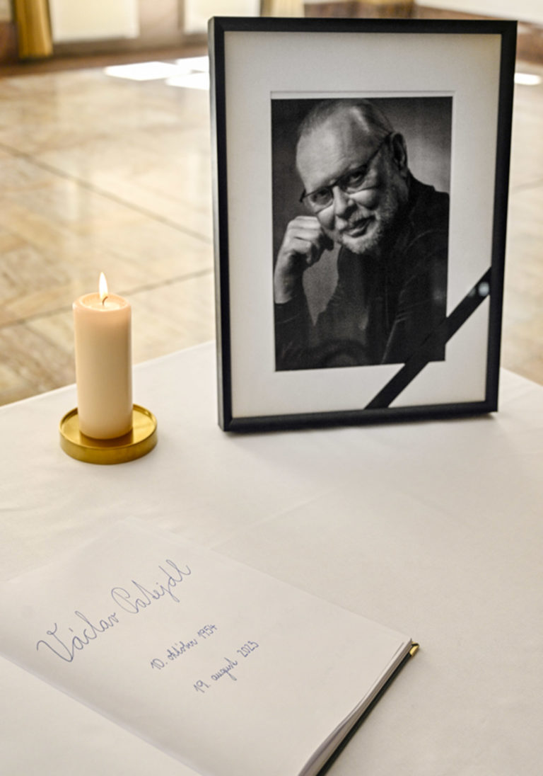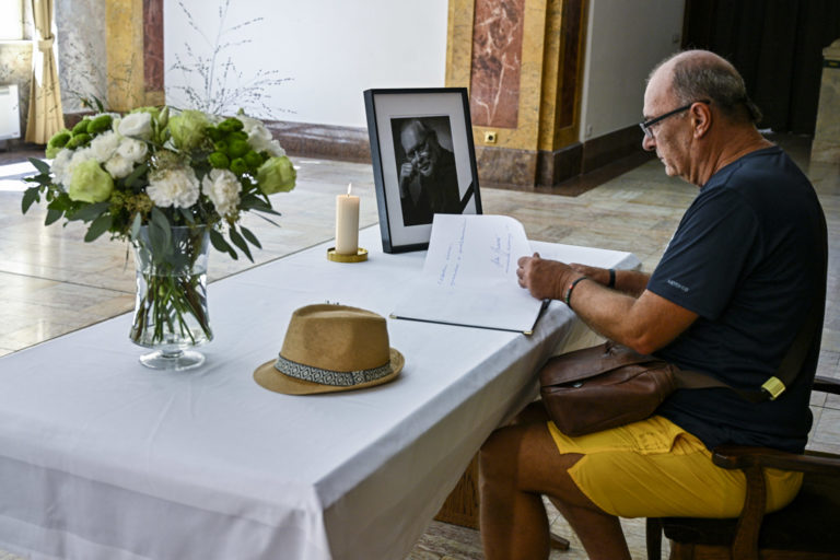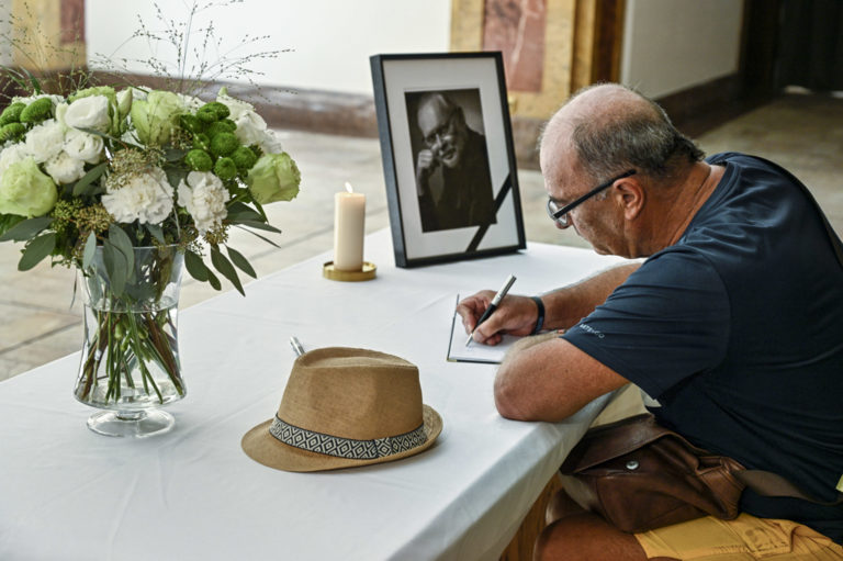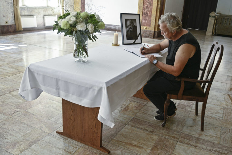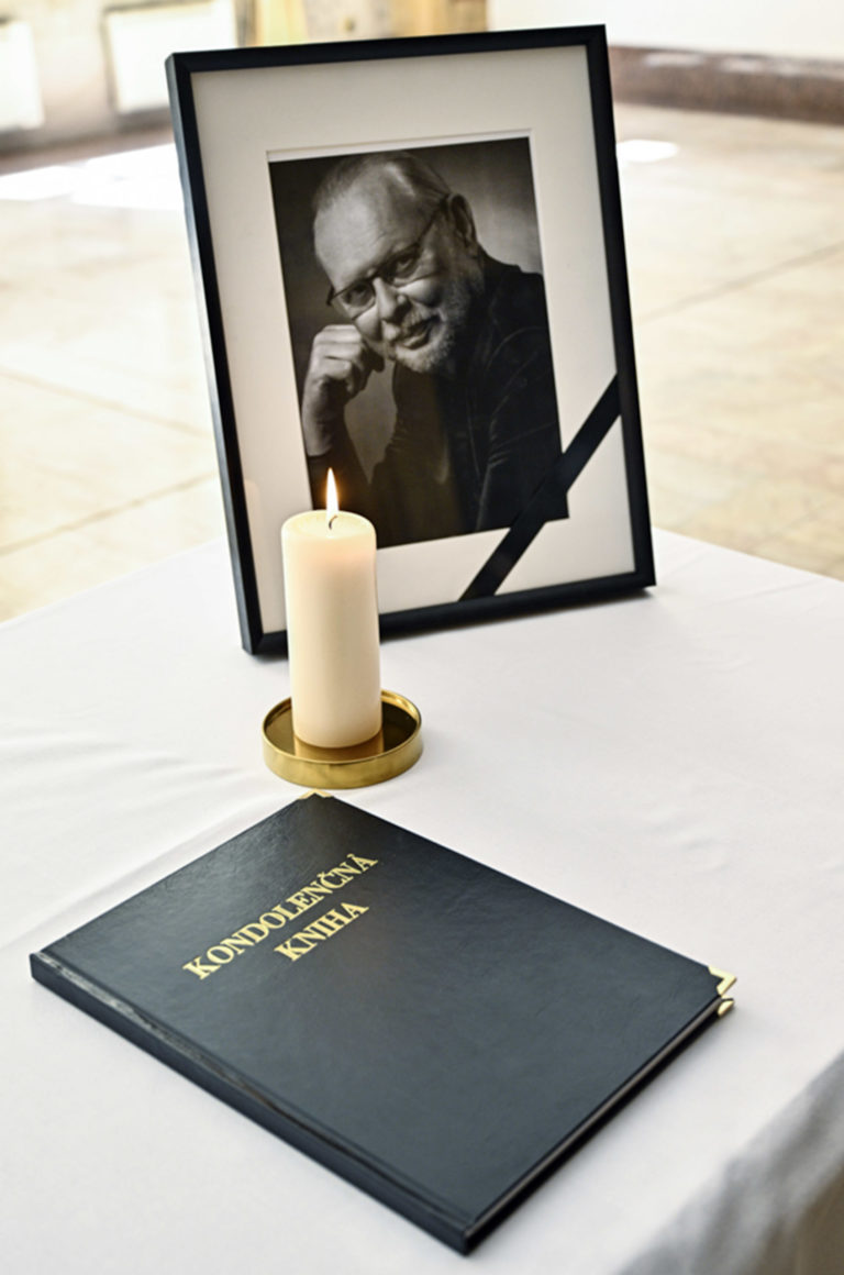 Kondolenčná kniha vo Dvorane Ministerstva kultúry SR počas uctenia si pamiatky zosnulého hudobníka a skladateľa Vaša Patejdla. Bratislava. 21. august 2023. Foto: SITA/Milan Illík