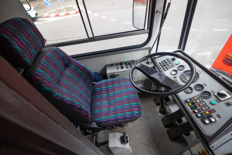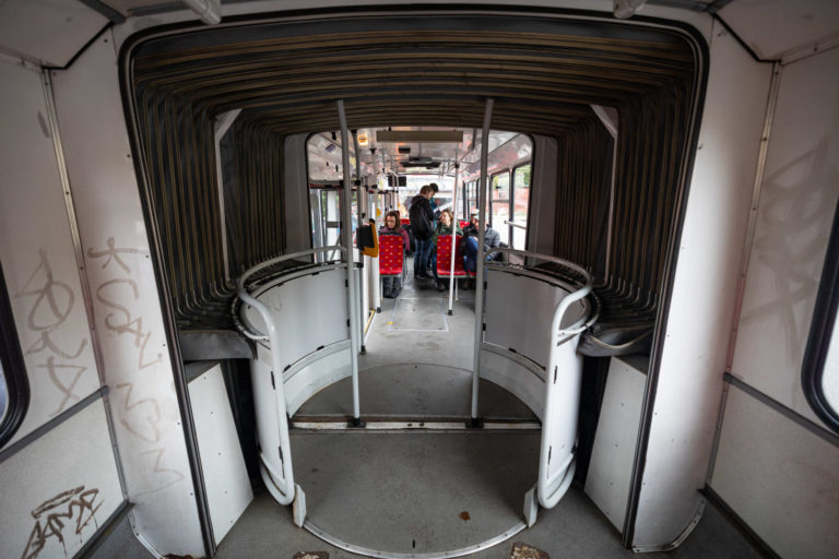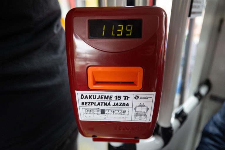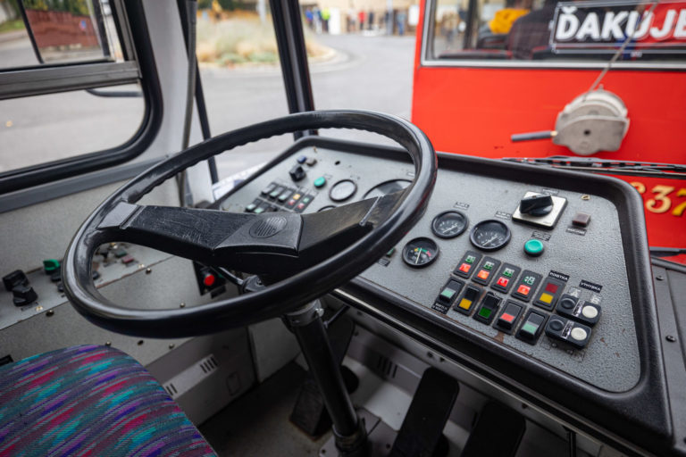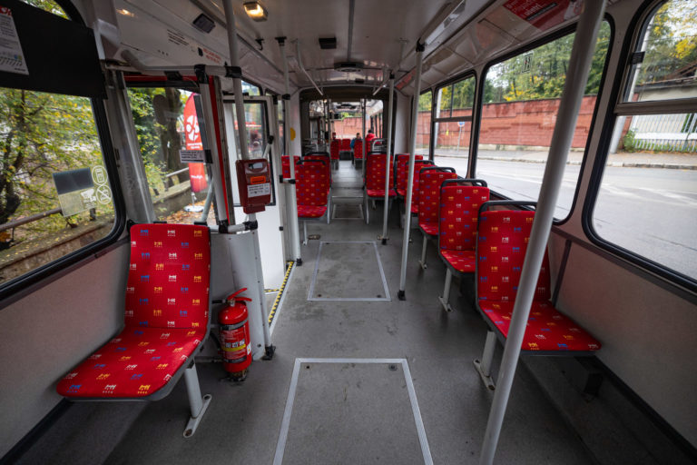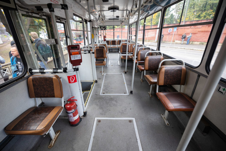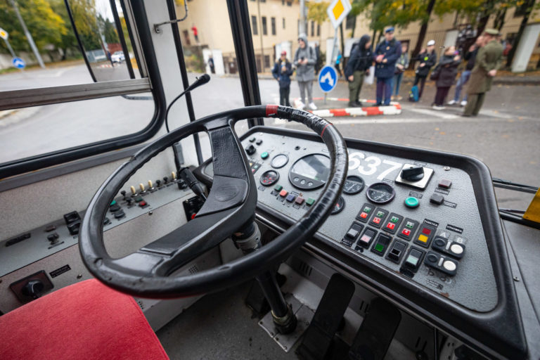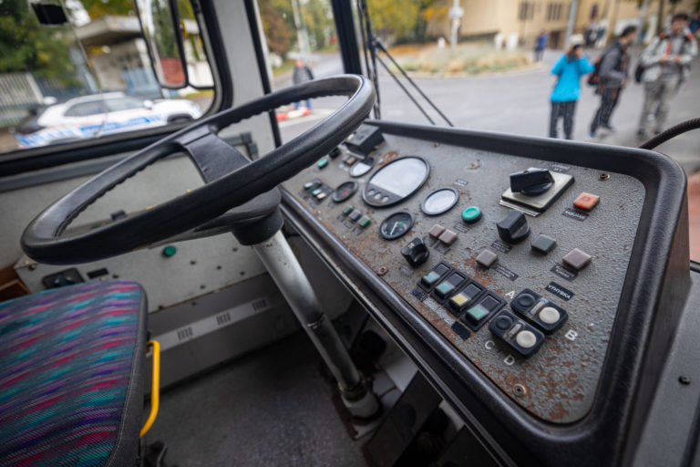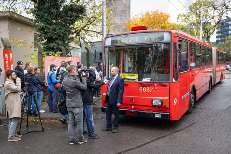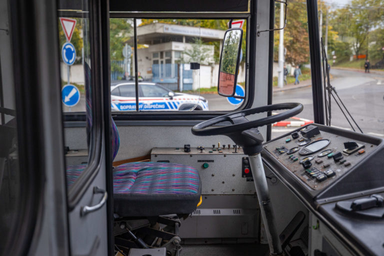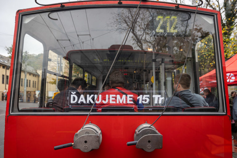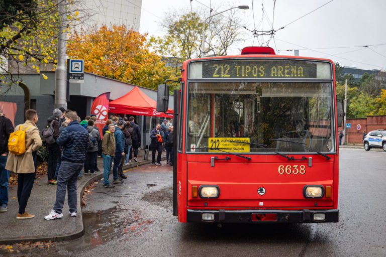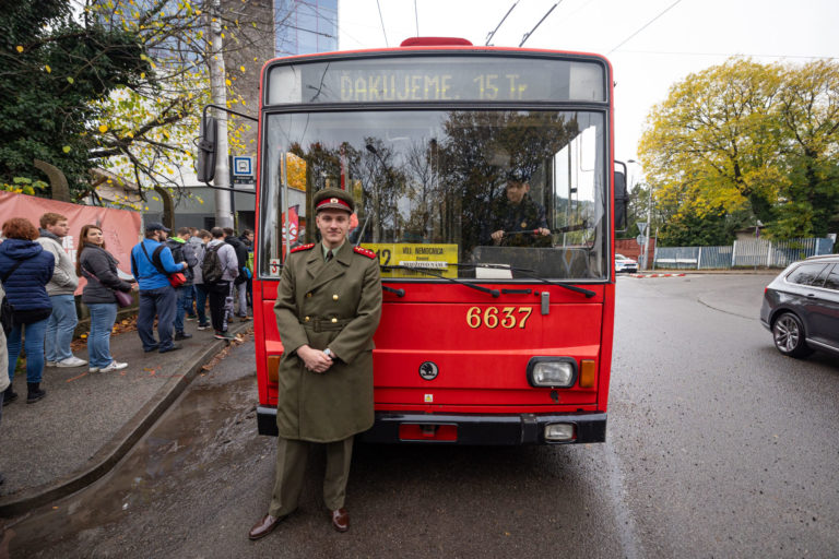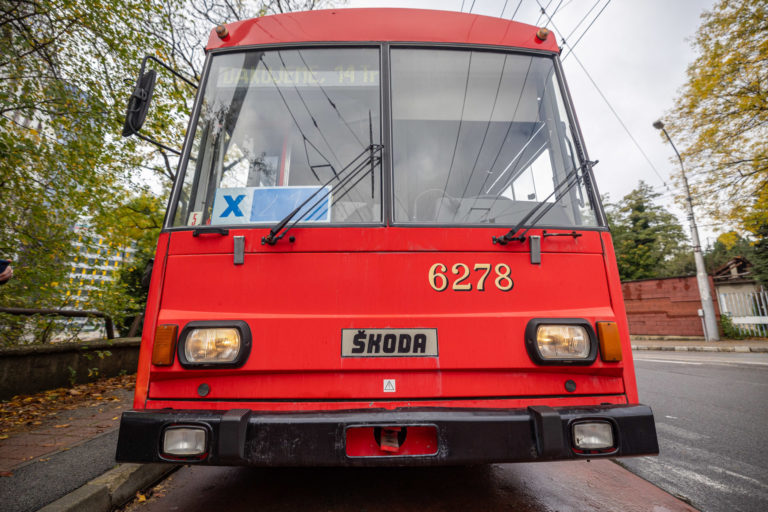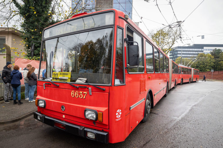 Kĺbový trolejbus Škoda 15 Tr(M) počas symbolickej rozlúčky s hranatými trolejbusmi, ktorú zorganizoval Dopravný podnik Bratislava (DPB) na zastávke Červený most. Bratislava, 5. november 2023. Foto: SITA/Jana Birošová