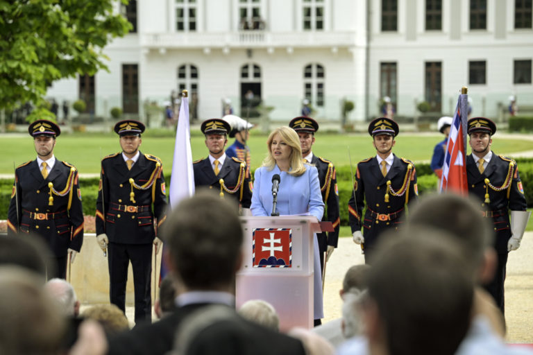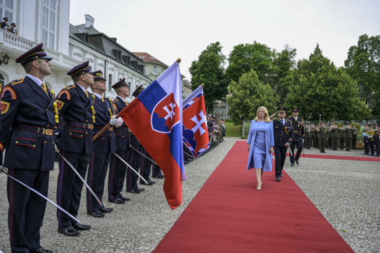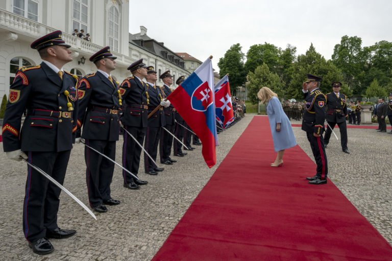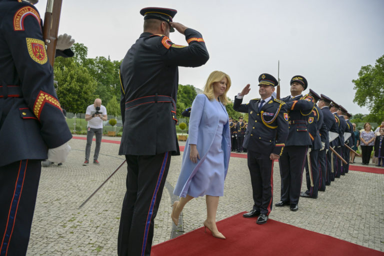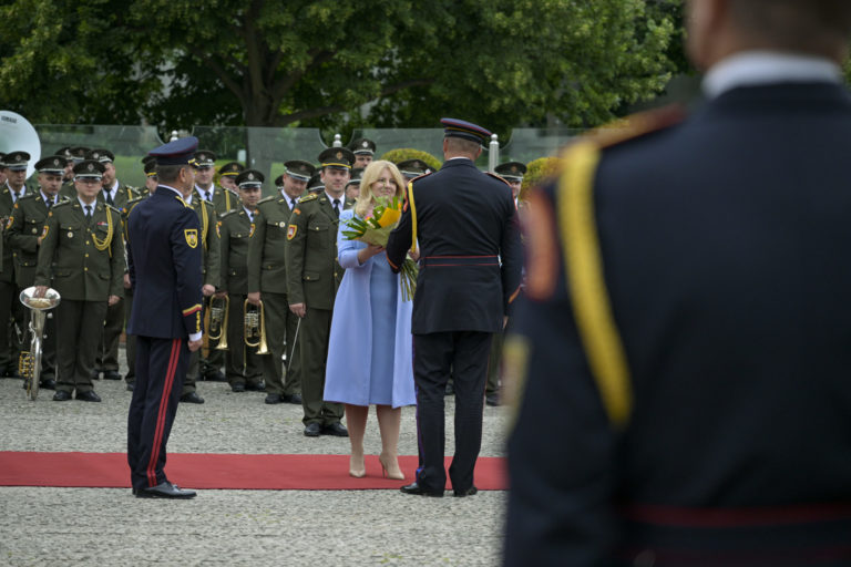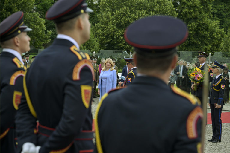 Prezidentka SR Zuzana Čaputová (uprostred) počas záverečnej prehliadky Čestnej stráže prezidenta Slovenskej republiky na Zadnom nádvorí Prezidentského paláca. Bratislava, 14. jún 2024. Foto: SITA/Milan Illík