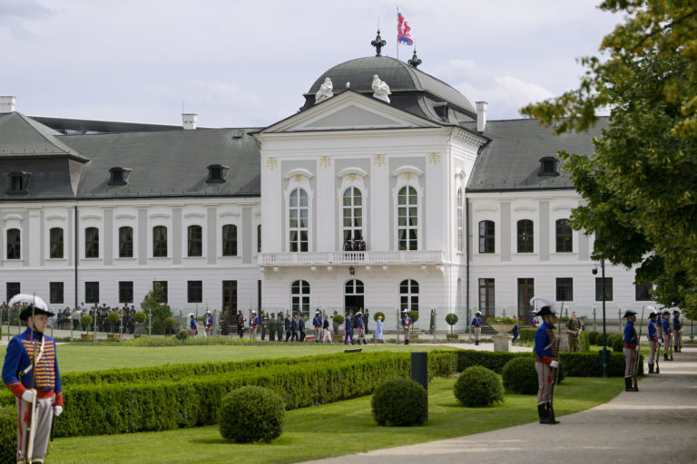 Prezidentka SR Zuzana Čaputová (tretia sprava) počas záverečnej prehliadky Čestnej stráže prezidenta Slovenskej republiky na Zadnom nádvorí Prezidentského paláca. Bratislava, 14. jún 2024. Foto: SITA/Milan Illík