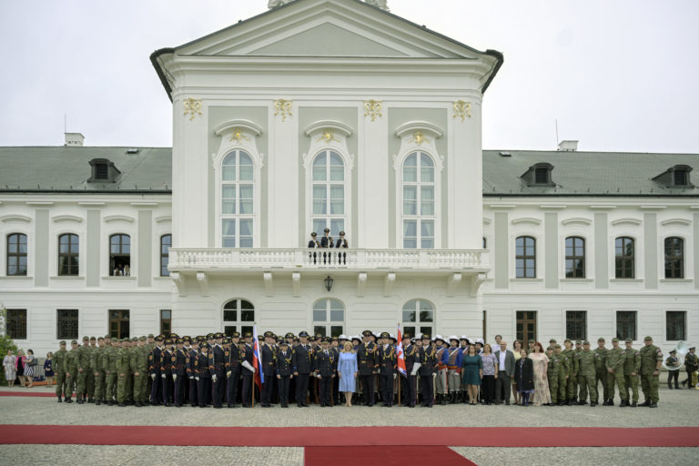 Prezidentka SR Zuzana Čaputová (uprostred) počas fototermínu v rámci záverečnej prehliadky Čestnej stráže prezidenta Slovenskej republiky na Zadnom nádvorí Prezidentského paláca. Bratislava, 14. jún 2024. Foto: SITA/Milan Illík