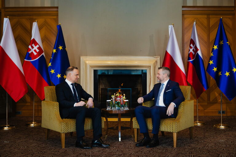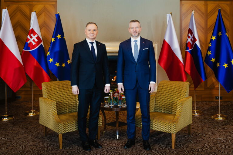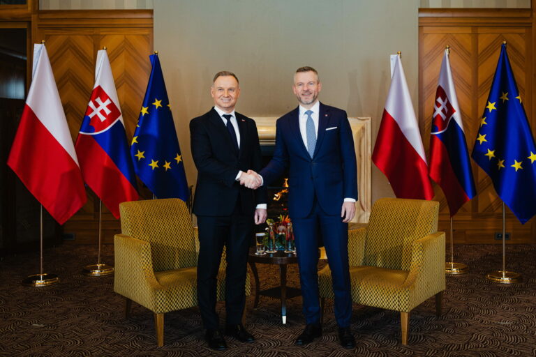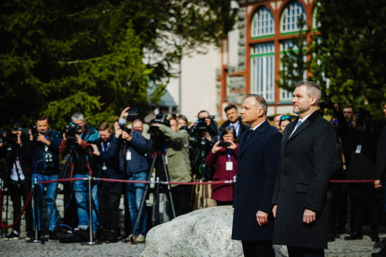 Sprava v popredí: Prezident SR Peter Pellegrini a prezident Poľska Andrzej Duda počas rozlúčkovej návštevy prezidenta Poľskej republiky na Slovensku, ktorá sa uskutočnila na Štrbskom Plese. Vysoké Tatry, 1. apríl 2025. Foto: SITA/Kancelária prezidenta SR