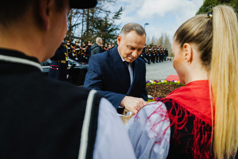 Prezident Poľska Andrzej Duda (uprostred) počas privítania chlebom a soľou v rámci rozlúčkovej návštevy prezidenta Poľskej republiky na Slovensku za účasti prezidenta SR, ktorá sa uskutočnila na Štrbskom Plese. Vysoké Tatry, 1. apríl 2025. Foto: SITA/Kancelária prezidenta SR