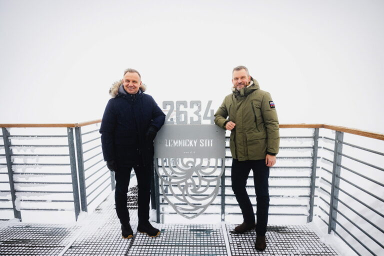 Sprava: Prezident SR Peter Pellegrini a prezident Poľska Andrzej Duda pózujú na vyhliadke vrcholu Lomnického štítu počas rozlúčkovej návštevy prezidenta Poľskej republiky na Slovensku, ktorá sa uskutočnila vo Vsokých Tatrách. Vysoké Tatry, 1. apríl 2025. Foto: SITA/Kancelária prezidenta SR.