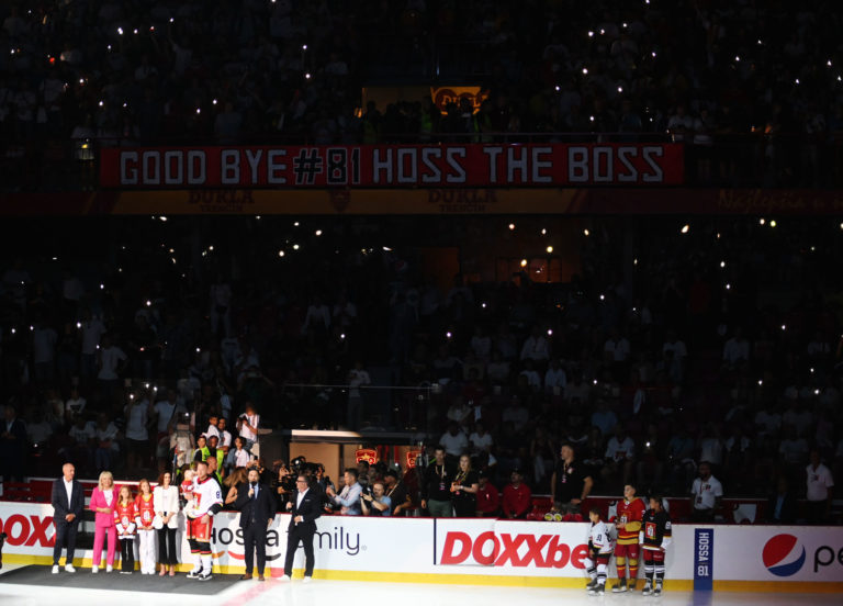 Atmosféra počas rozlúčky slovenského hokejistu Mariána Hossu s aktívnou kariérou Goodbye Game 81 na zimnom štadióne Pavla Demitru v Trenčíne. Trenčín, 18. august 2023. Foto: SITA/Tomáš Somr