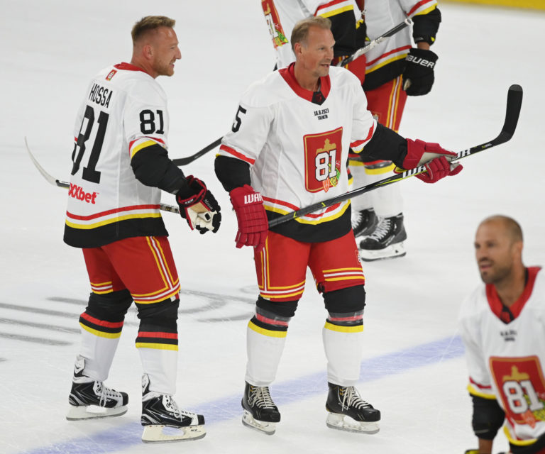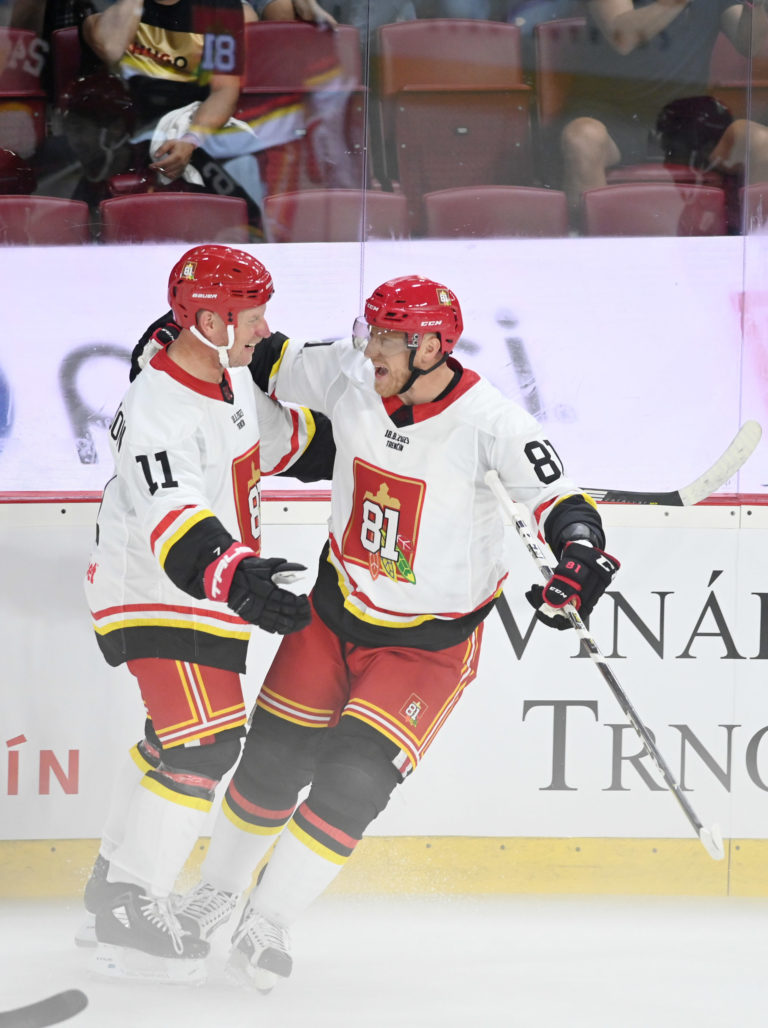Sprava: Bývalý švédsky hokejista Nicklas Lidström a slovenský hokejista Marián Hossa počas rozlúčkoveho zápasu Goodbye Game 81 na zimnom štadióne Pavla Demitru v Trenčíne. Trenčín, 18. august 2023. Foto: SITA/Tomáš Somr