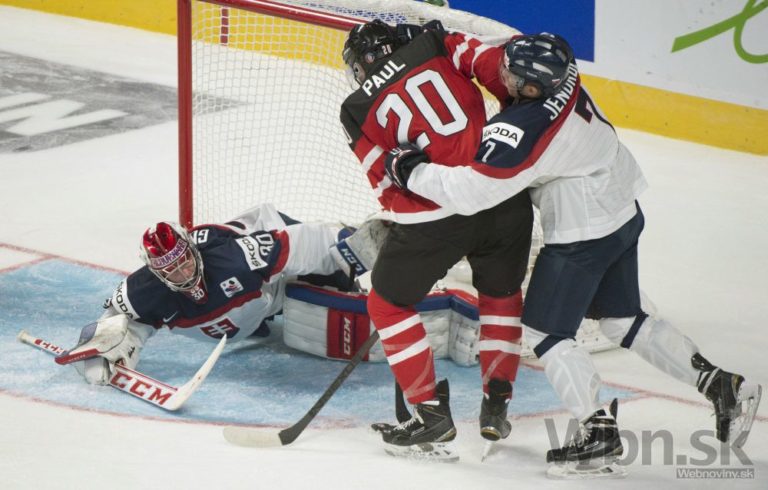Slovenský brankár Denis Godla vyráža puk pred českým útočníkom Jakubom Vránom počas štvrťfinálového zápasu na MS hráčov do 20 rokov. Montreal, 2. január 2015. Foto: SITA/AP