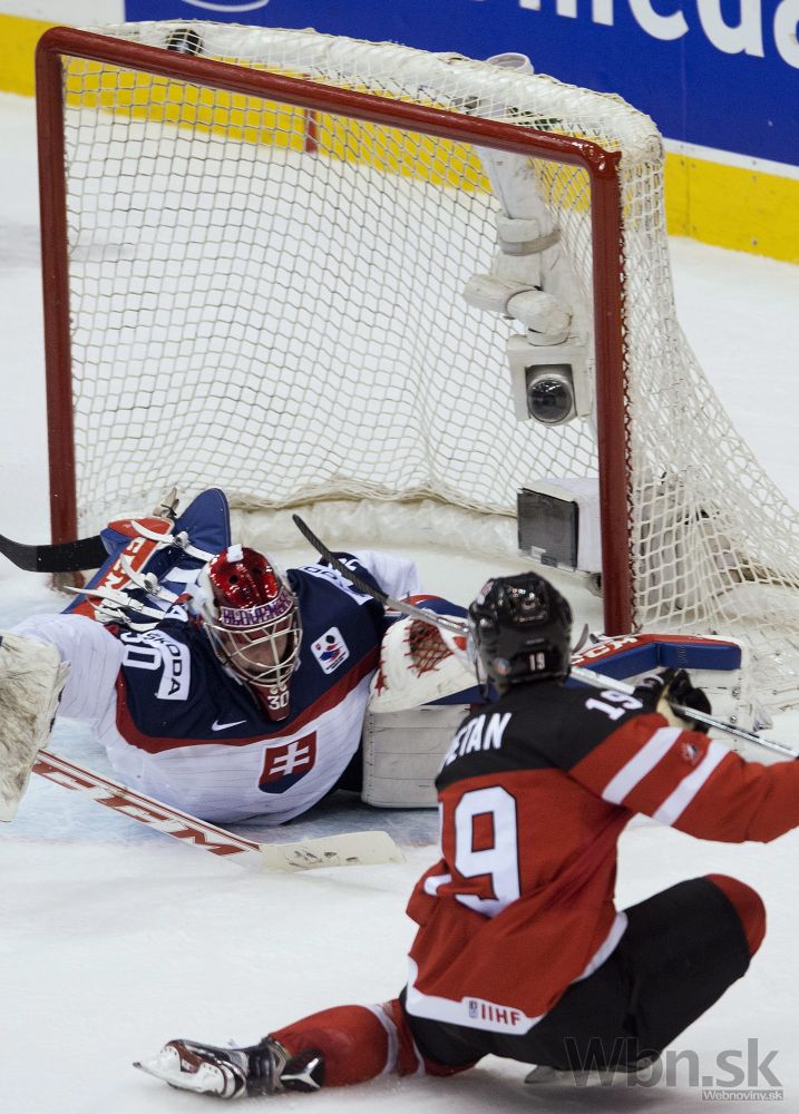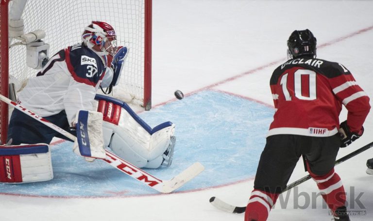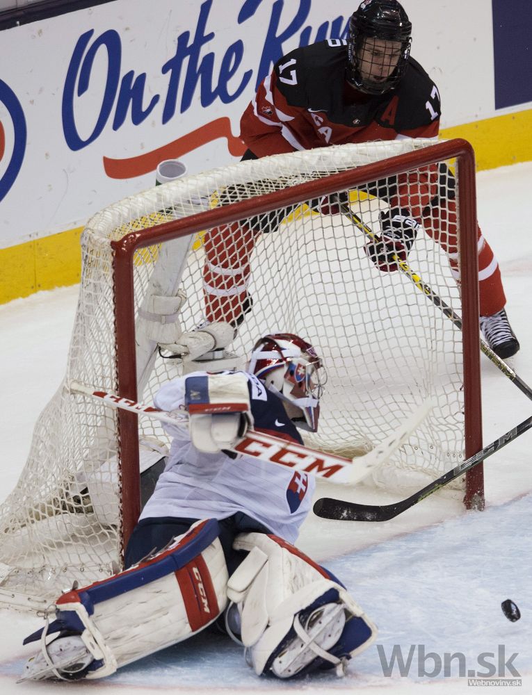 Kanadský útočník Nic Petan prekonáva slovenského brankára Denisa Godlu počas semifinálového zápasu na MS hokejistov do 20 rokov. Toronto, 4. január 2015. Foto: SITA/AP
