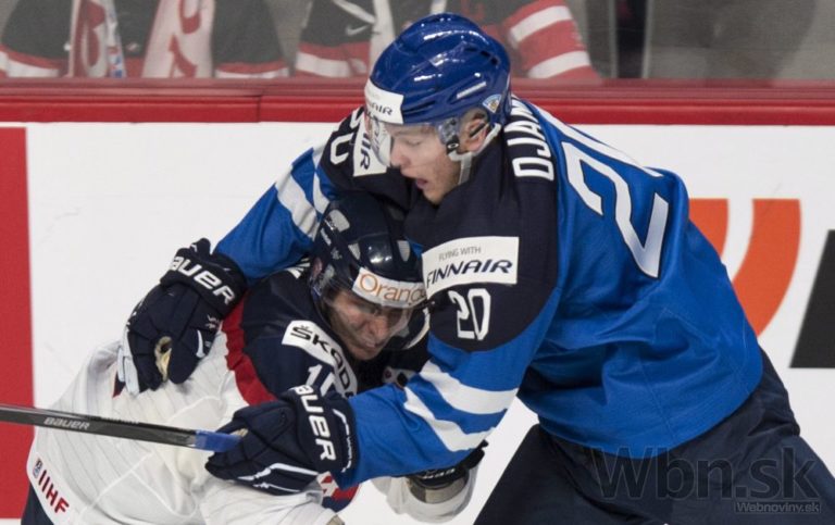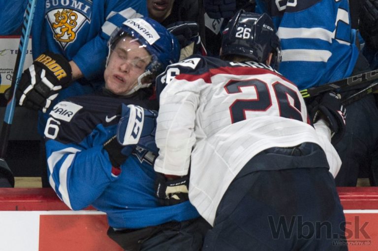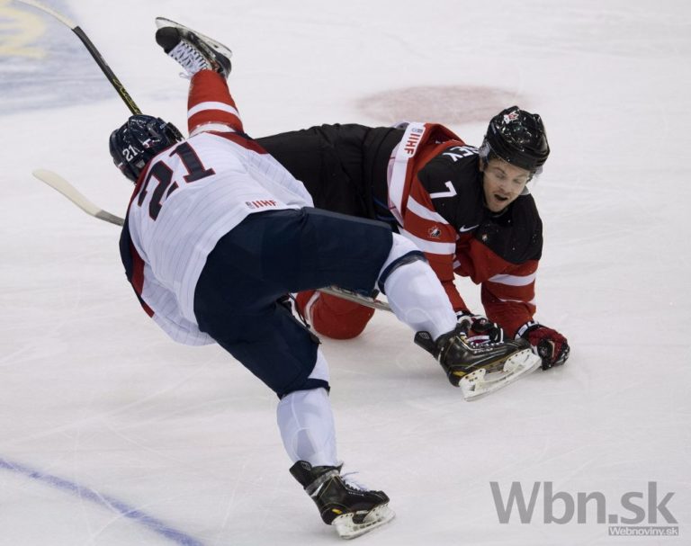 Americký útočník Tyler Motte v súboji so slovenským obrancom Mislavom Rosandičom počas zápasu na MS hráčov do 20 rokov. Montreal, 29. december 2015. Foto: SITA/AP
