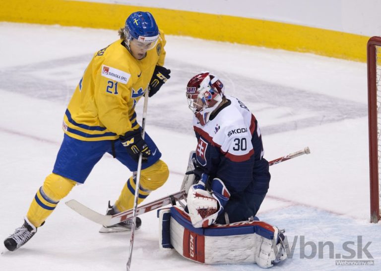 Švédsky útočník William Nylander sa snaží prekonať slovenského brankára Denisa Godlu počas zápasu o bronz na MS hráčov do 20 rokov. Toronto, 5. január 2015. Foto: SITA/AP