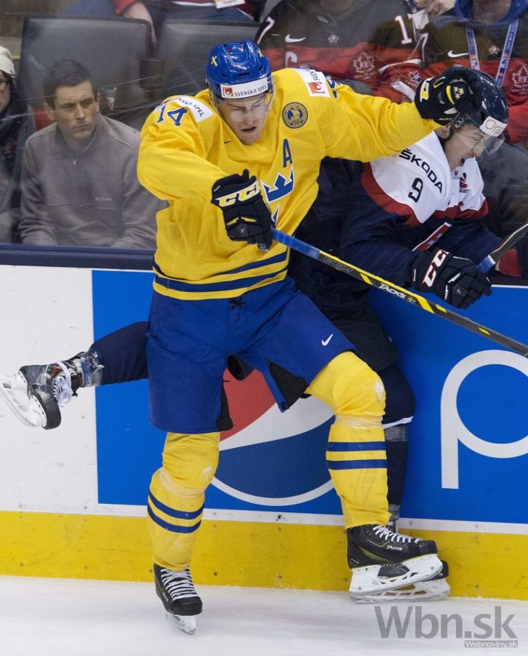 Slovenský útočník Samuel Petráš v súboji so švédskym obrancom Robertom Haggom počas zápasu o bronz na MS hokejistov do 20 rokov. Toronto, 5. január 2015. Foto: SITA/AP