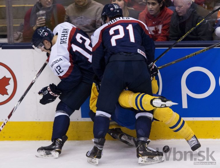 Slováci David Šoltés a Dominik Rehák v súboji so švédskym obrancom Robertom Haggom počas zápasu o bronz na MS hokejistov do 20 rokov. Toronto, 5. január 2015. Foto: SITA/AP