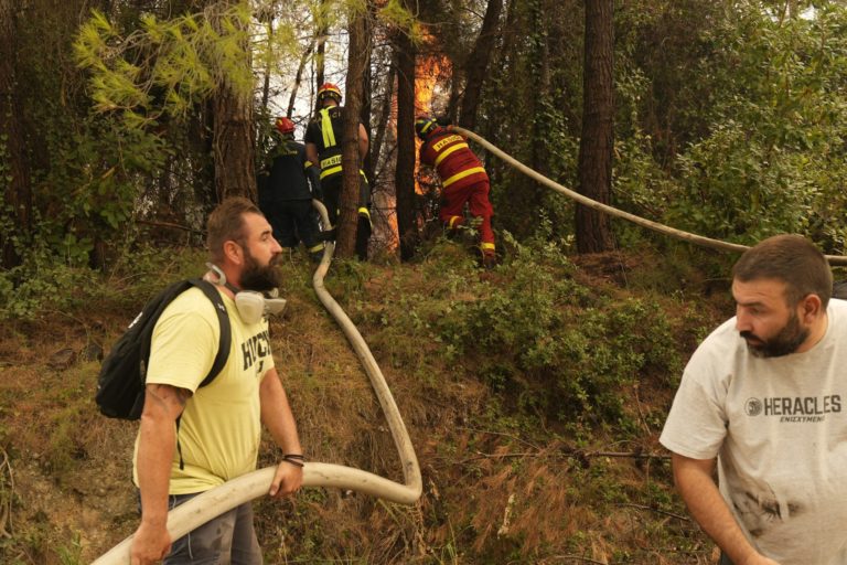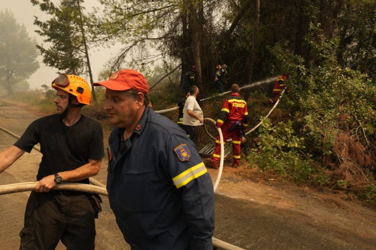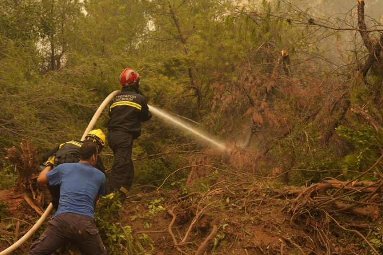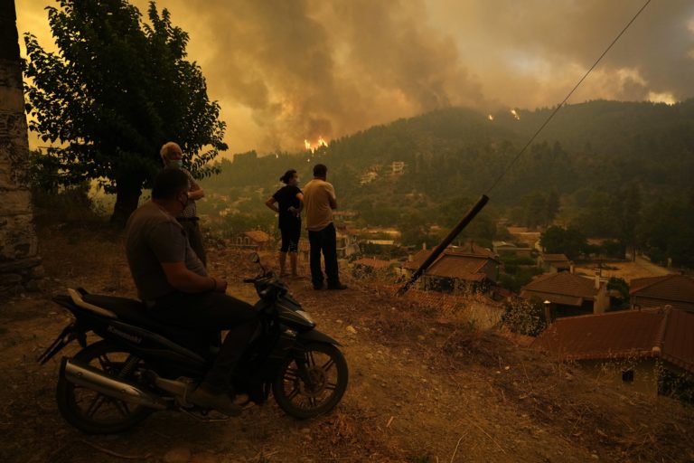 Požiarnici bojujú s požiarom lesa v dedinke Avgaria na ostrove Evia. Grécko, Evia 11.8.2021. Foto: SITA/AP