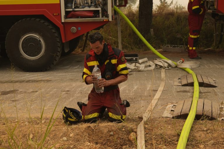Hasič zo Slovenska sa snaží schladiť po hasení požiaru lesa v obci Avgaria na ostrove Evia. Grécko, Evia, 11.8.2021. Foto: SITA/AP