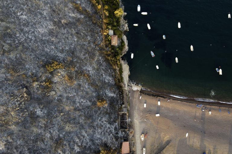 Spálené vrchy nad plážou Agia Anna na ostrove Evia. Grécko, Evia 11.8.2021. Foto: SITA/AP