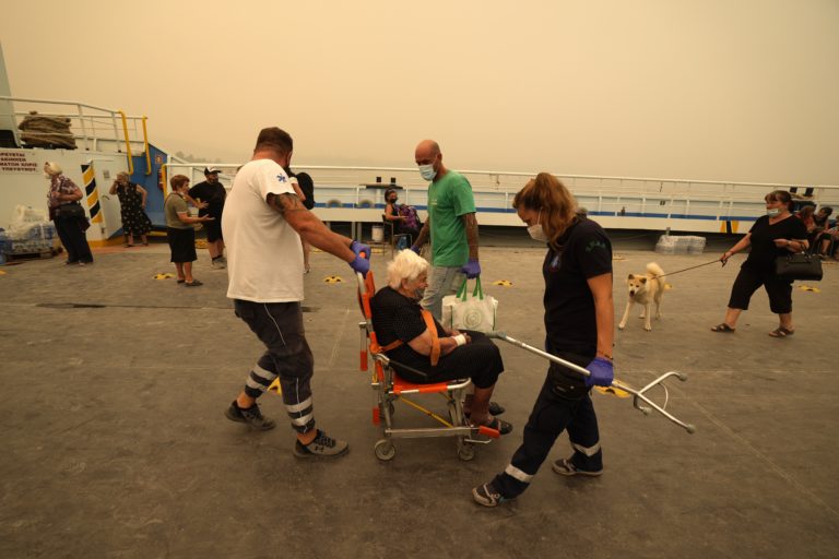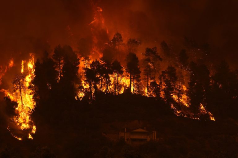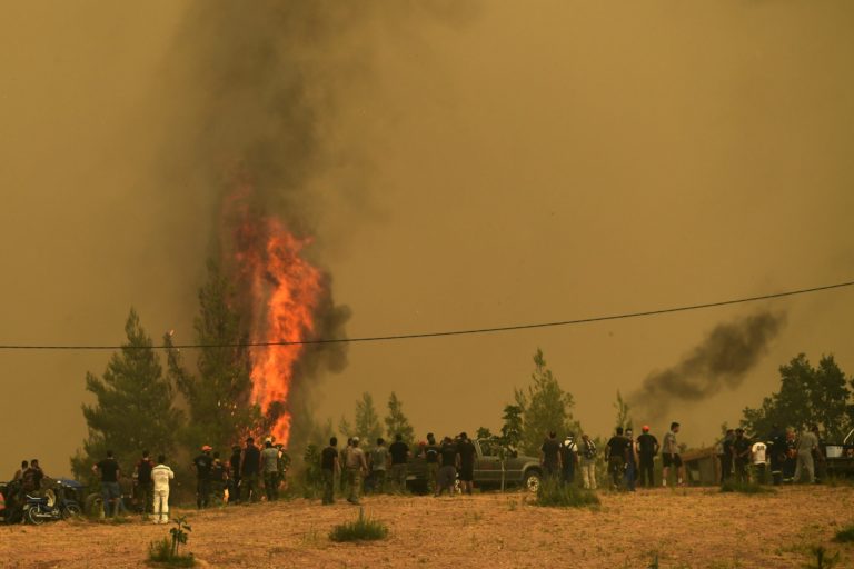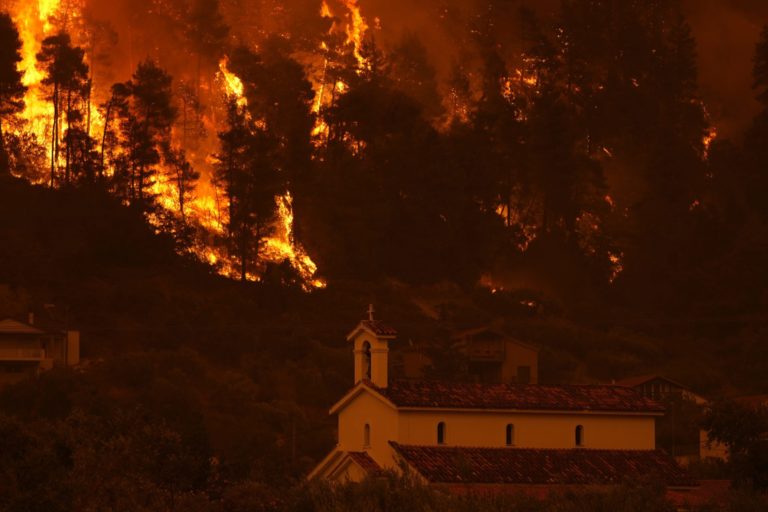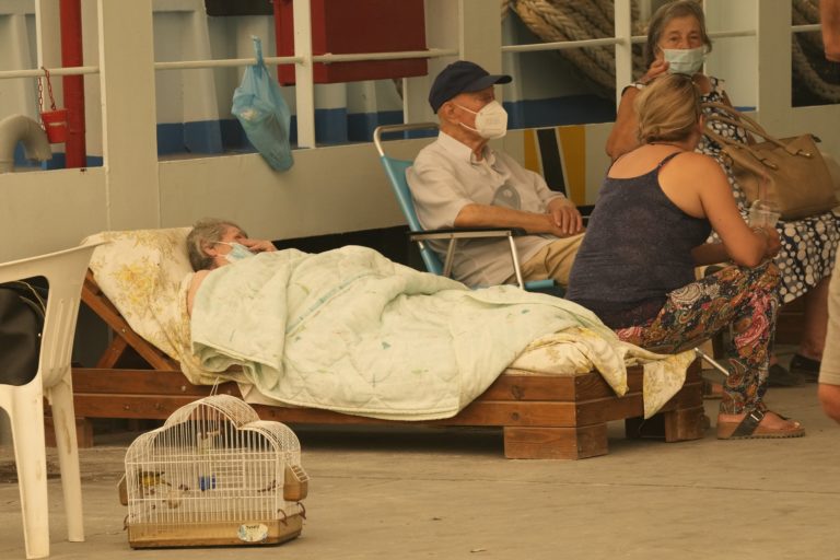Požiar na Eubóji spálil rozsiahle oblasti lesa, zničil domy a prevádzky a vyhnal z domovov tisícky ľudí. Dym a popol z ohňa zahalil ostrov a obloha v dôsledku neho zoranžovela. Mnoho obcí je pre požiar bez elektriny aj tečúcej vody. Foto: SITA/AP