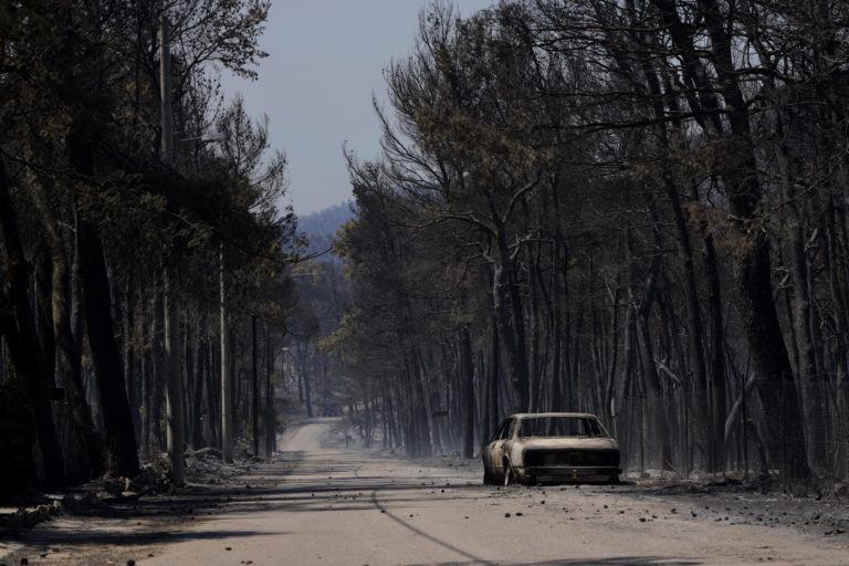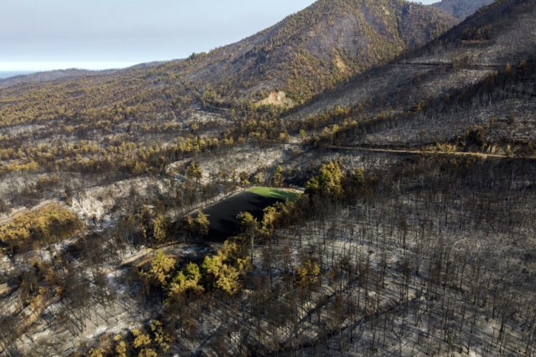 Plamene zničili les neďaleko dedinky Galatsona na ostrove Evia. Grécko, Evia 9.8.2021 Foto: SITA/AP
