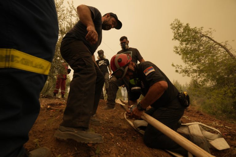 Požiarnikom zo Srbska pomáhajú pri hasení požiarov v Kamarii aj miestny obyvatelia. Grécko, Evia, 11.8.2021. Foto: SITA/AP
