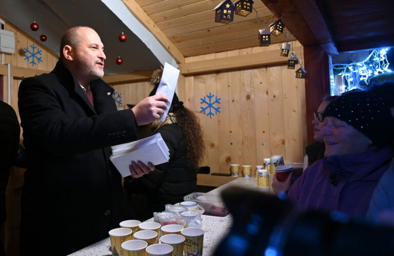 Primátor Košíc Jaroslav Polaček (vľavo) núkal primátorsky punč a rozdával lístky na košické oko počas slávnostného otvorenia 29. ročníka Košických rozprávkových Vianoc. Košice, 1. december 2024. Foto: SITA/Viktor Zamborský.