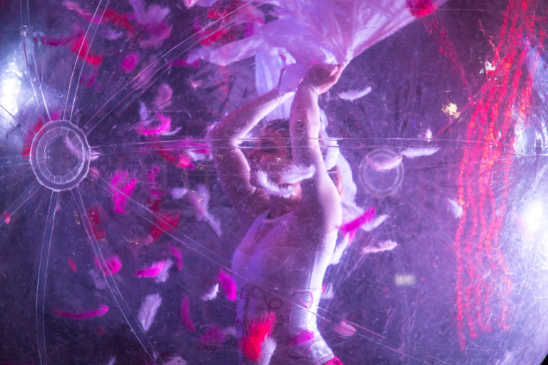 Tanečnica v zorbingovej guli počas predstavenia v rámci otvorenia Vianočných trhov 2017 na Hlavnom námestí v Bratislave. Bratislava, 24. november 2017. Foto: SITA/Branislav Bibel