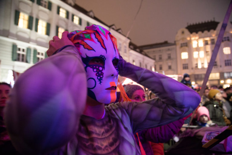 Tanečnica v maske pred vystúpením na pódiu v rámci otvorenia Vianočných trhov 2017 na Hlavnom námestí v Bratislave. Bratislava, 24. november 2017. Foto: SITA/Branislav Bibel