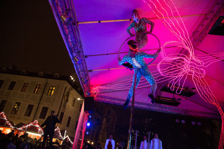 Tanečno-akrobatické predstavenie na pódiu v rámci otvorenia Vianočných trhov 2017 na Hlavnom námestí v Bratislave. Bratislava, 24. november 2017. Foto: SITA/Branislav Bibel