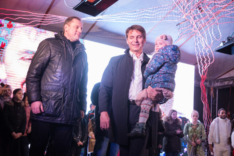 Zľava: Starosta bratislavskej mestskej časti Staré Mesto Radoslav Števčík a primátor Bratislavy Ivo Nesrovnal s dcérou na pódiu počas otvorenia Vianočných trhov 2017 na Hlavnom námestí v Bratislave. Bratislava, 24. november 2017. Foto: SITA/Branislav Bibel