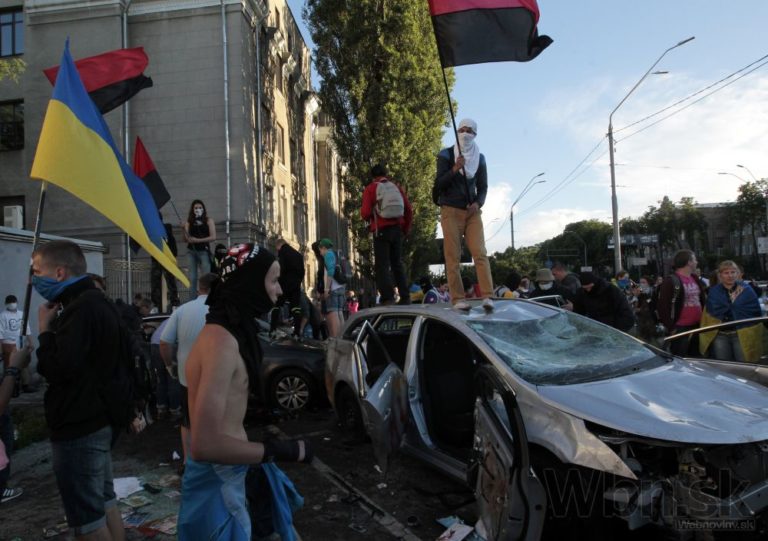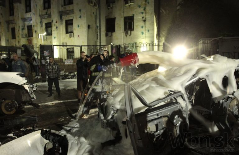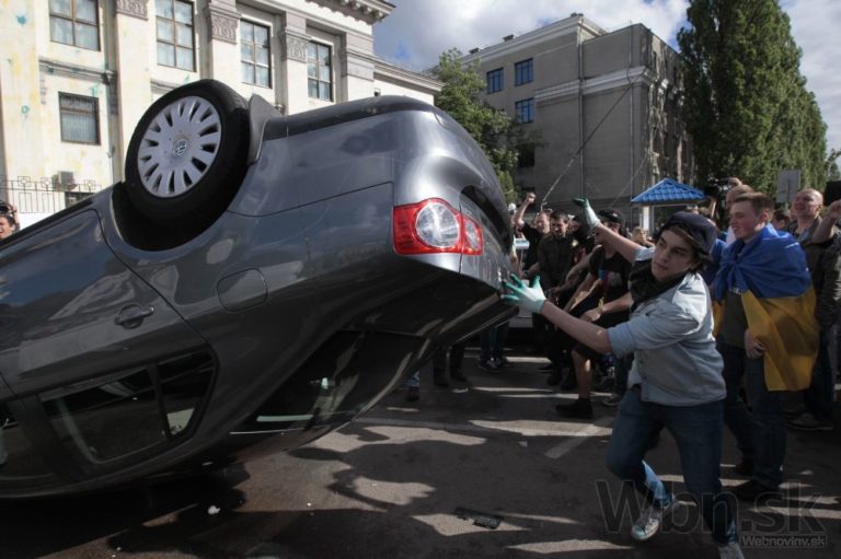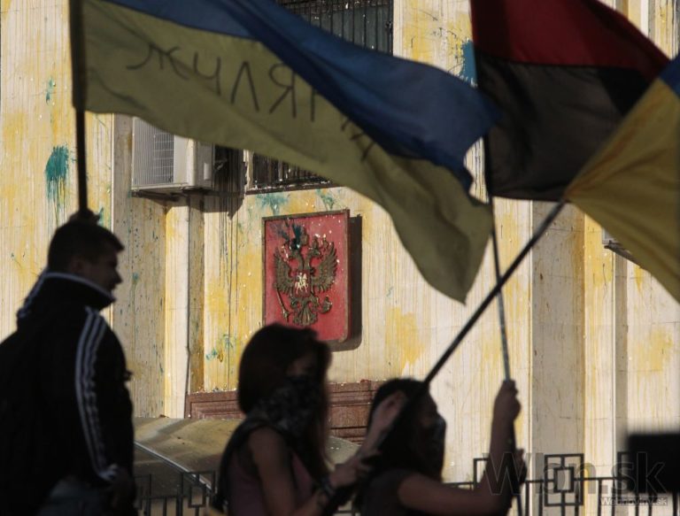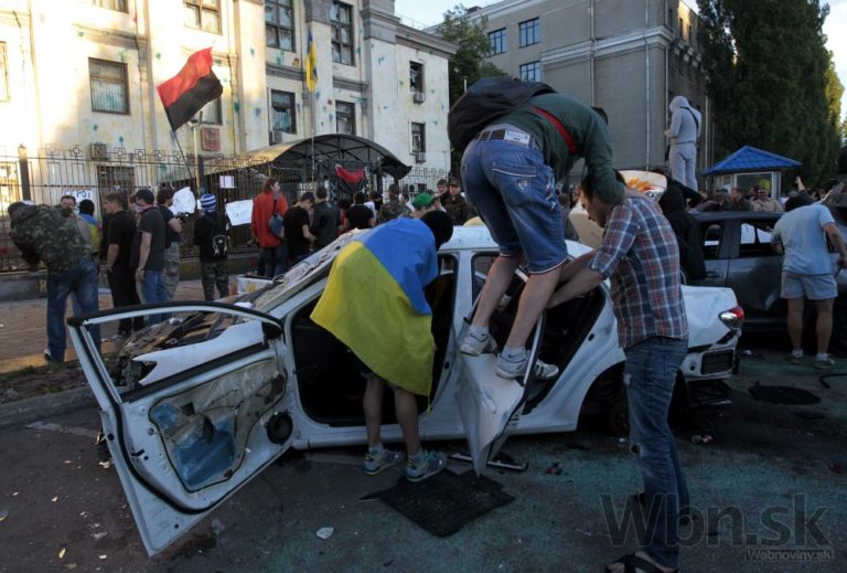 Násilie pred budovou ruského veľvyslanectva v ukrajinskej metropole Kyjev. Ambasáda sa stala terčom útoku stoviek ľudí, ktorí poškodzovali jej majetok. Násilie bolo odpoveďou na nočné zostrelenie ukrajinského lietadla proruskými povstalcami. Ukrajina, Kyjev, 14. júna 2014. Foto: SITA/AP