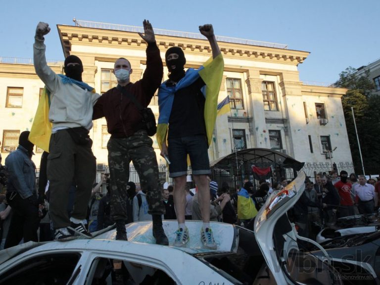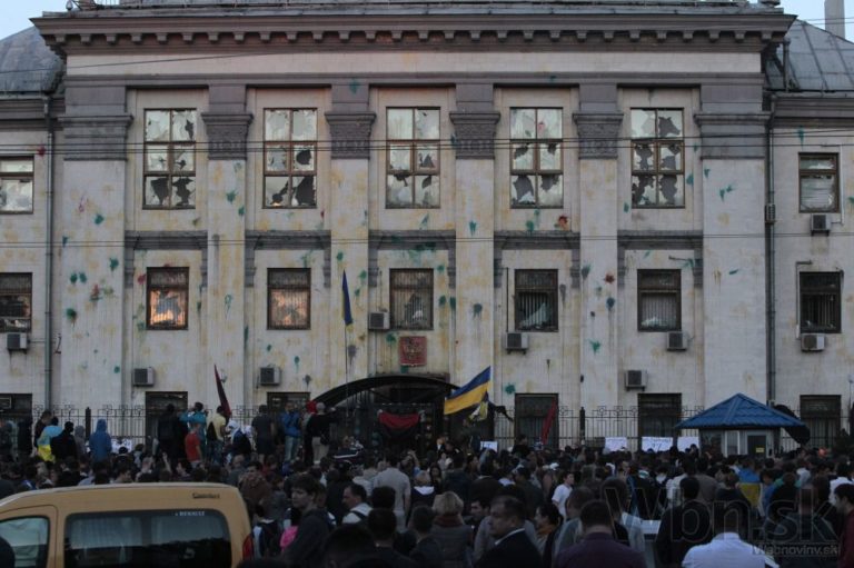 Násilie pred budovou ruského veľvyslanectva v ukrajinskej metropole Kyjev. Ambasáda sa stala terčom útoku stoviek ľudí, ktorí poškodzovali jej majetok. Násilie bolo odpoveďou na nočné zostrelenie ukrajinského lietadla proruskými povstalcami. Ukrajina, Kyjev, 14. júna 2014.