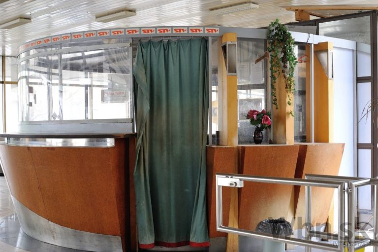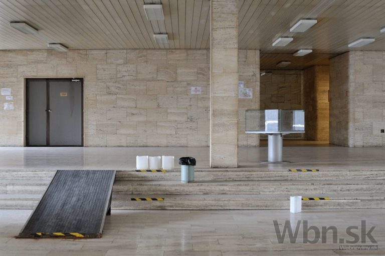 Rozhlas a televízia Slovenska (RTVS) opustila výškovú budovu v Mlynskej doline v Bratislave. Zamestnanci, ktorí pracovali v budove známej takmer 40 rokov ako symbol verejnoprávnej televízie, sa presťahovali do náprotivného zrekonštruovaného zdravotného strediska. Výšková budova ostala po vysťahovaní prázdna. ého zdravotného strediska. Výšková budova ostala po vysťahovaní prázdna. Na snímke pohľad na detail vrátnice vo vestibule výškovej budovy RTVS. Bratislava, 5. marec 2015. Foto: SITA/Robert Tappert