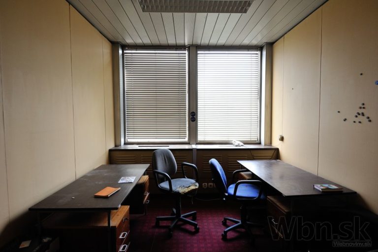 Rozhlas a televízia Slovenska (RTVS) opustila výškovú budovu v Mlynskej doline v Bratislave. Zamestnanci, ktorí pracovali v budove známej takmer 40 rokov ako symbol verejnoprávnej televízie, sa presťahovali do náprotivného zrekonštruovaného zdravotného strediska. Výšková budova ostala po vysťahovaní prázdna. ého zdravotného strediska. Výšková budova ostala po vysťahovaní prázdna. Na snímke pohľad do opustenej kancelárie. Bratislava, 5. marec 2015. Foto: SITA/Robert Tappert