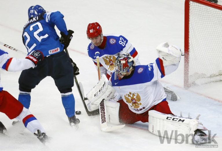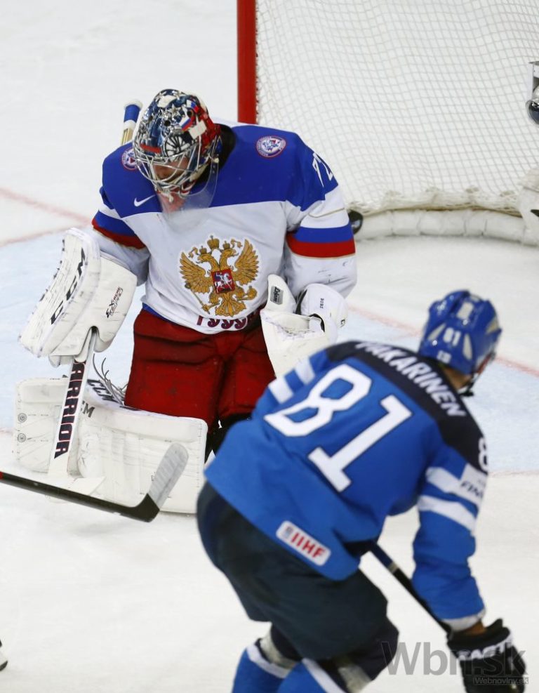 Fínsky útočník Miikka Salomaki sa snaží prekonať ruského brankára Sergeja Bobrovského počas finálového zápasu na svetovom šampionáte v Minsku. Foto: SITA/AP