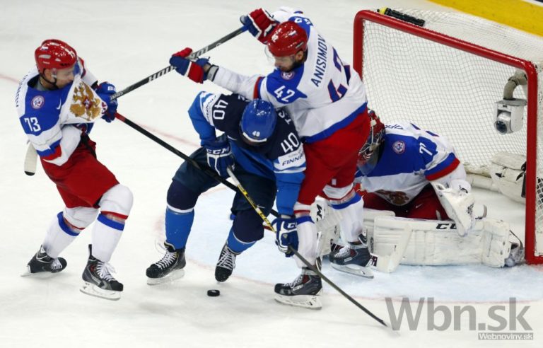 Fínsky útočník Tomi Sallinen v súboji s ruskými hokejistami Arťomom Anisimovom a Maximom Čudinovom pred brankárom Sergejom Bobrovským počas finálového zápasu na svetovom šampionáte v Minsku. Foto: SITA/AP