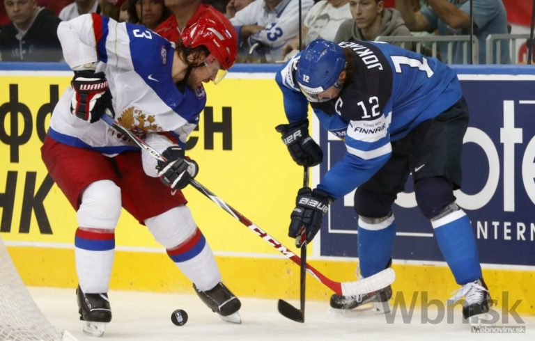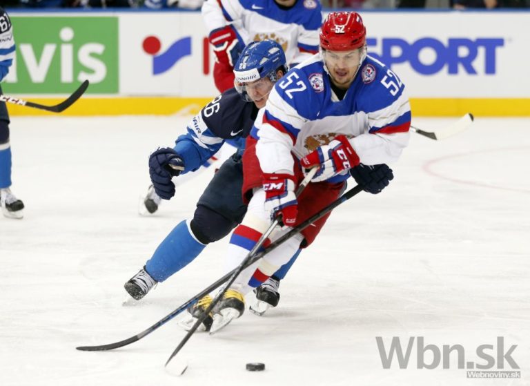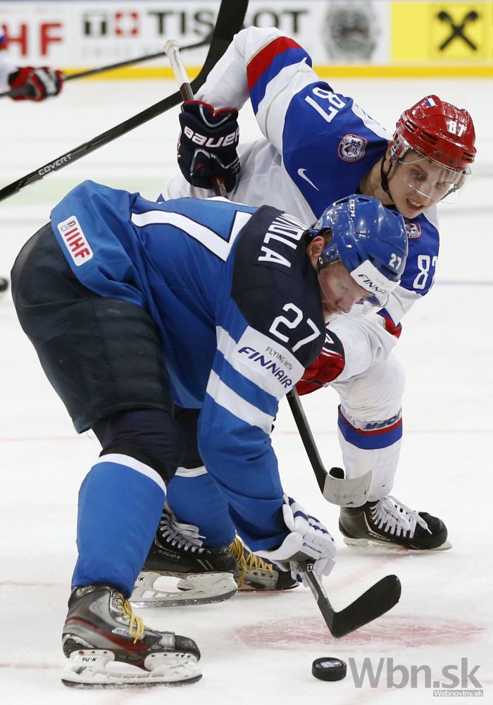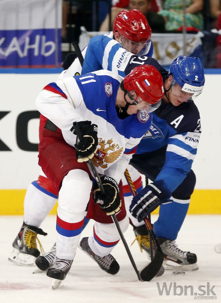 Fínsky obranca Juuso Hietanen v súboji s ruským útočníkom Jevgenijom Malkinom počas finálového zápasu na MS v hokeji. Foto: SITA/AP