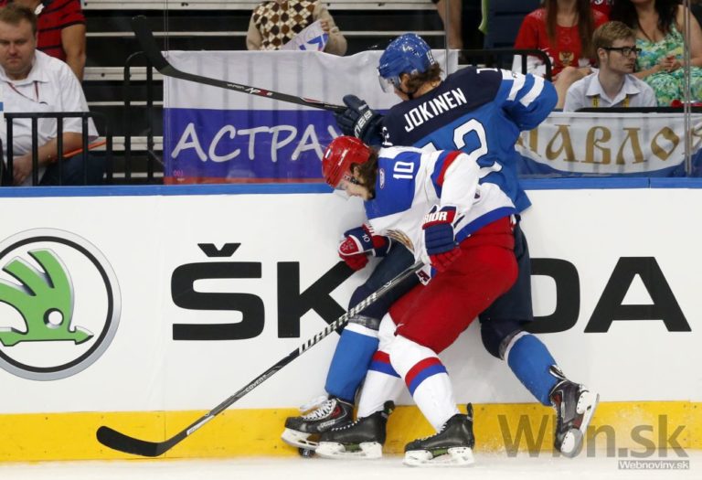 Fín Jarkko Immonen v súboji ruským útočníkom Sergejom Širokovom počas finálového zápasu na MS v hokeji. Foto: SITA/AP