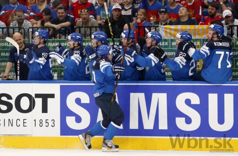 Fínsky útočník Iiro Pakarinen sa raduje so spoluhráčmi z gólu, ktorý strelil Rusom počas finálového zápasu na MS v hokeji. Foto: SITA/AP