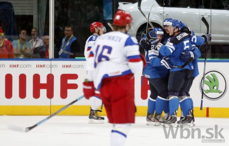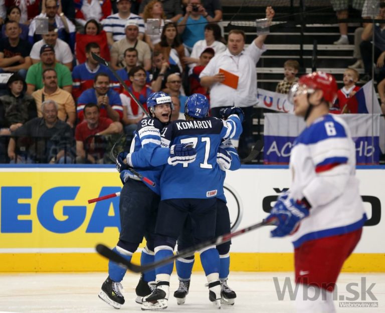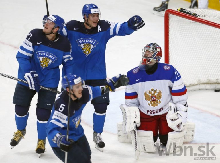 Fínski hokejisti sa radujú z gólu v sieti Ruska počas finálového zápasu na MS v hokeji. Foto: SITA/AP